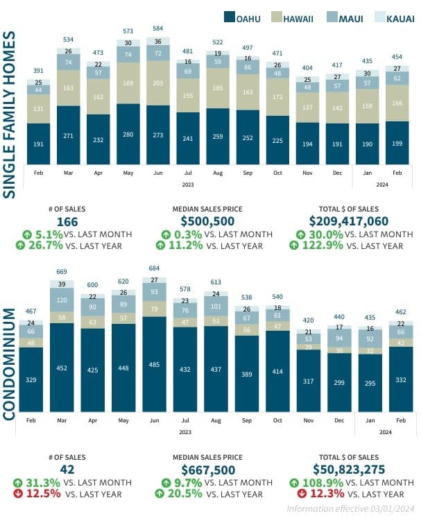 The Big Island's real estate market in February 2024 witnessed a continuation of the seller's market trend with some interesting shifts. Median sale prices climbed compared to February 2023. Single-family homes saw an 11.2% increase to $500,500, while condos experienced a more significant jump of 20.5% to $667,500. Overall sales activity presented a mixed picture. Single-family home sales surged by 26.7% year-over-year, indicating strong demand. Conversely, condo sales dipped by 12.5%, suggesting a potential cooling in that segment. The market remained competitive, reflected in the decrease in median days on the market for both homes (down 37% to 26 days) and condos (down 15% to 11 days).